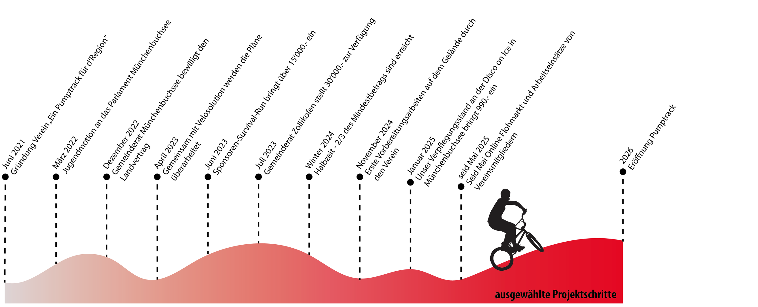 8 Jugendliche und junge Erwachsene treffen sich in der Jugendfachstelle Münchenbuchsee und gründen den Verein «Ein Pumptrack für Münchenbuchsee». Ziel ist, auf dem Gelände der Saal- und Freizeitanlage einen Pumptrack zu realisieren. In den folgenden Monaten erstellen die Vereinsmitglieder eine Budgetplanung, erarbeiten mit der Firma Velosolution eine Streckenplanung, erstellen ein Finanzierungskonzept und eine Dokumentation zuhanden der Behörden.